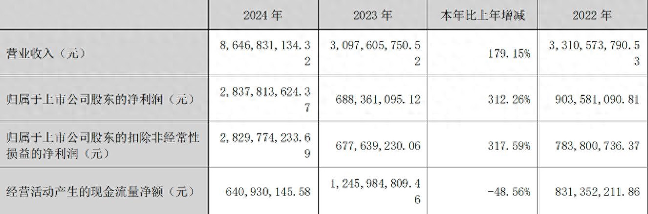 4月22日晚间,新易盛发布2024年年报。年报显示,2024年,公司实现营业收入86.47亿元,同比增长179.15%;净利润28.38亿元,同比增长312.26%;扣非净利润28.3亿元,同比增长317.59%。