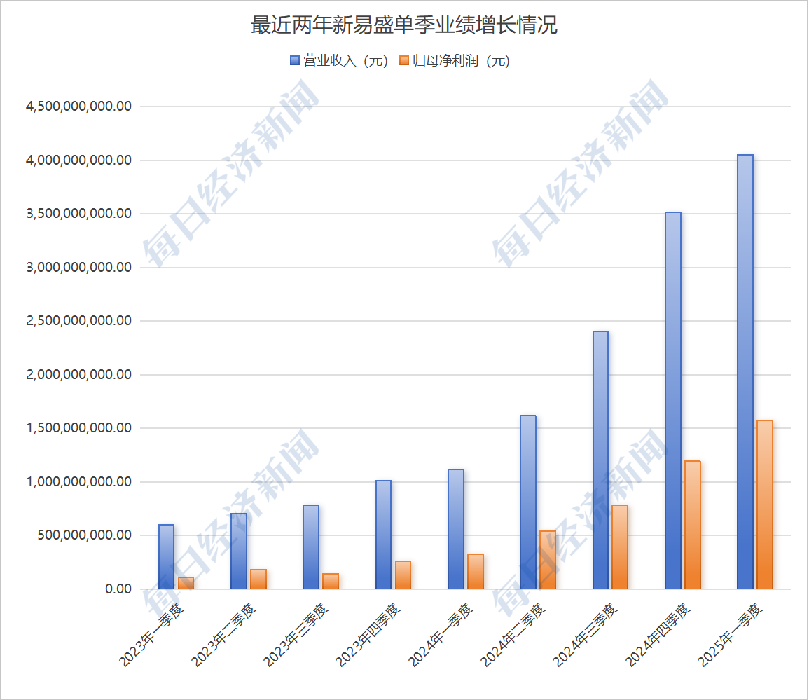 财务数据显示,2024年度,新易盛实现营业收入86.47亿元,同比增长179.15%;归母净利润为28.38亿元,同比增长312.26%。2025年第一季度,公司实现营业收入40.52亿元,同比增长264.13%;归母净利润为15.73亿元,同比增长384.54%。值得一提的是,公司营业收入已经连续9个季度实现环比增长。