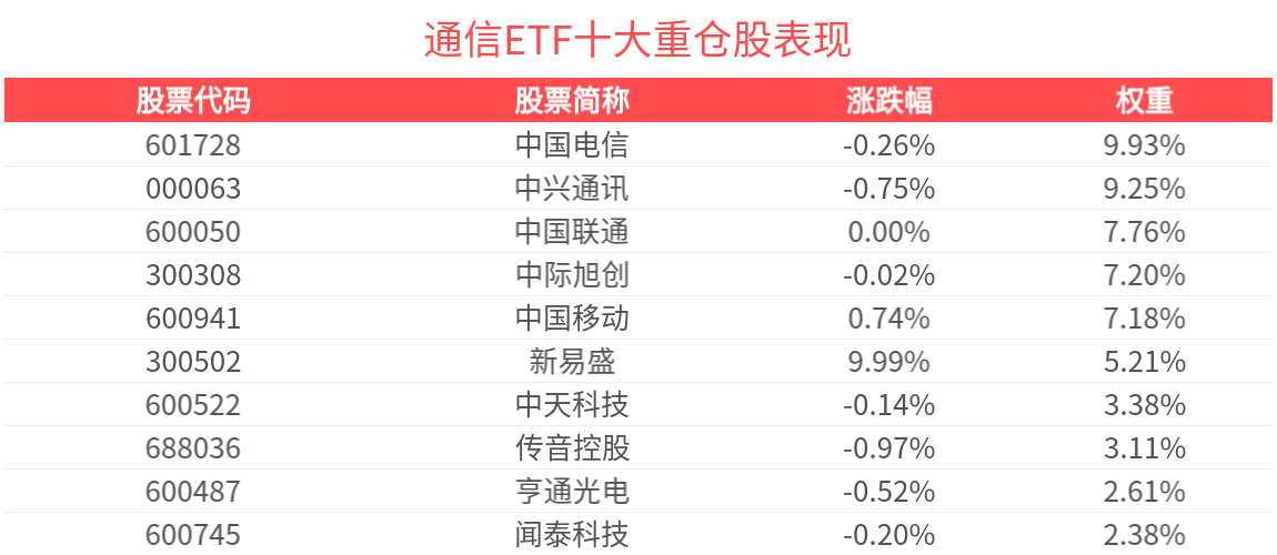 数据显示,截至2025年6月30日,国证通信指数前十大权重股分别为中际旭创、中国电信、新易盛、中国移动、中兴通讯、中国联通、中天科技、传音控股、天孚通信、闻泰科技,前十大权重股合计占比59.17%。