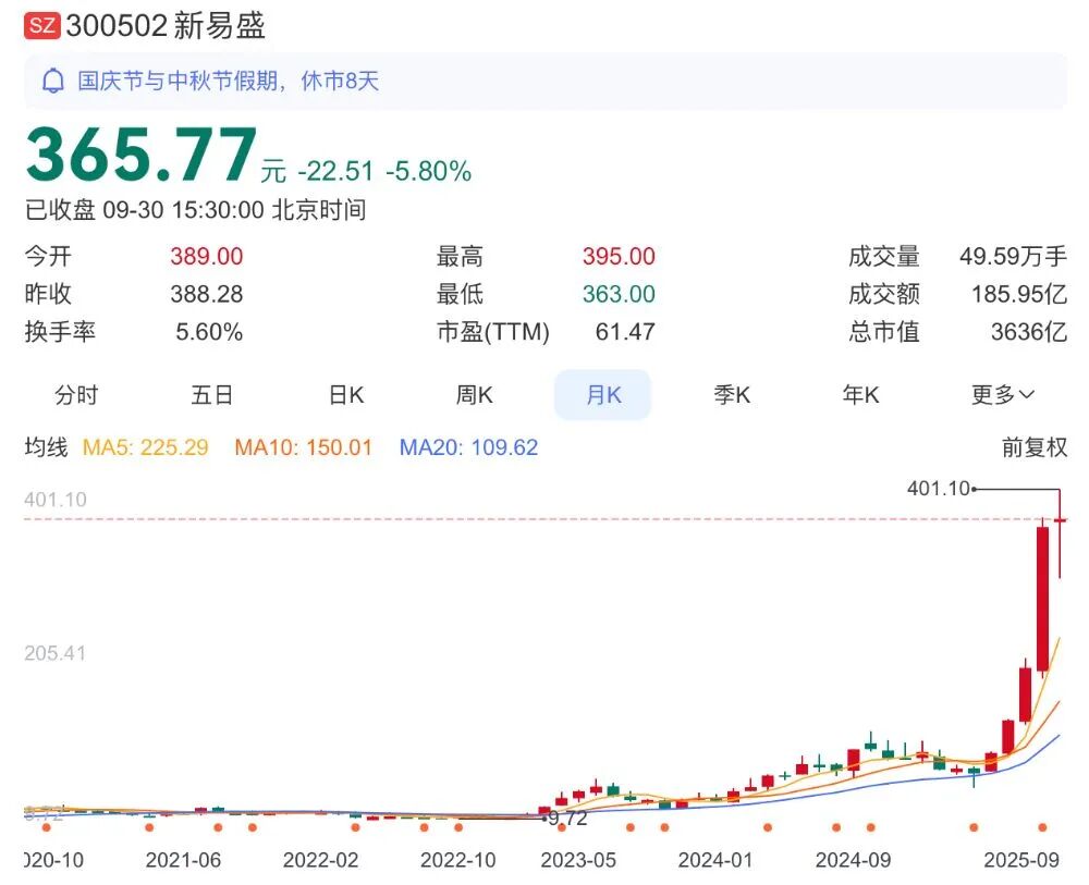 而9月3日至9月30日合计20个交易日内,新易盛最低价为295.16元,最高价为398.60元,均价347.50元。所以,7折价格为243.25元,拟转让价格较9月30日每股365.77元的价格打了6.6折。以此计算,高光荣拟转让股份最低可套现27.80亿元。