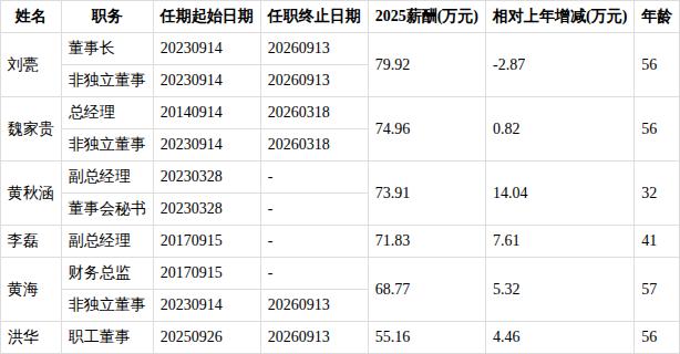 根据2025年报数据,剔除独立董事、监事会主席、监事后,川金诺共有6位董事和高级管理人员。从年龄看,川金诺董事和高级管理人员平均年龄为50岁,年龄中位数为56岁,其中,财务总监及非独立董事黄海年龄最高为57岁,副总经理及董事会秘书黄秋涵年龄最小为32岁。从薪酬看,董事和高级管理人员合计领取报酬424.55万元,平均薪酬73.88万元,年薪中位数为73.91万元。其中,董事长及非独立董事刘甍薪酬最高为79.92万元,财务总监及非独立董事黄海薪酬最低为68.77万元(2025年任期不满1年的不参与统计)。