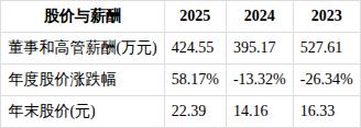 近三年董事和高级管理人员薪酬方面,2023年薪酬总额为527.61万元,2024年薪酬总额为395.17万元,2025年薪酬总额为424.55万元。从2023年到2025年,董事和高管薪酬总额减少103.06万元,降幅19.53%。