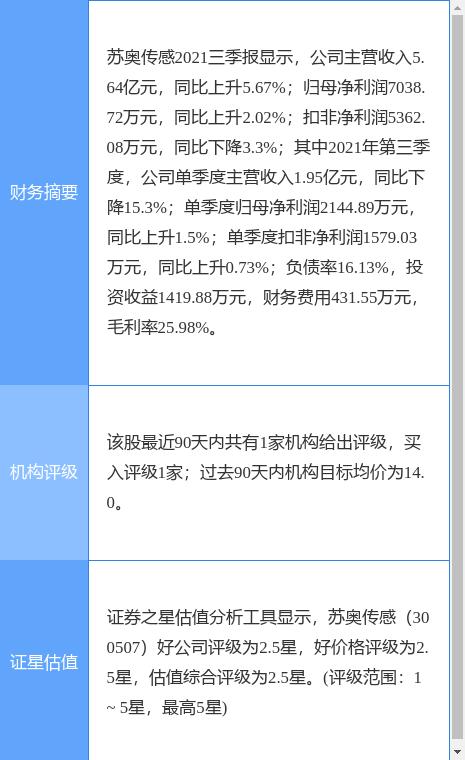 苏奥传感发布2021年年度报告,实现营业收入8.57亿元,同比增长5.38%;归母净利润9840.52万元,同比下降5.63%;基本每股收益0.22元,拟每10股派发现金红利0.60元(含税),以资本公积金向全体股东每10股转增6股。