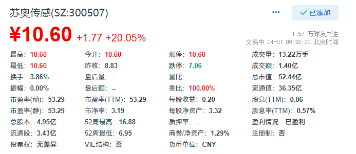刘治颖 4月7日,截止9:32分,苏奥传感(SZ300507)涨20.05%报10.6元,封上涨停板,成交额1.4亿元,总市值52.44亿元。