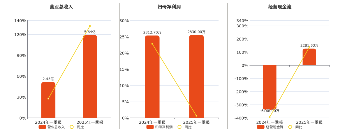 公司营业总收入为5.64亿元。归母净利润为2830.00万元。经营活动现金净流入为2281.53万元。