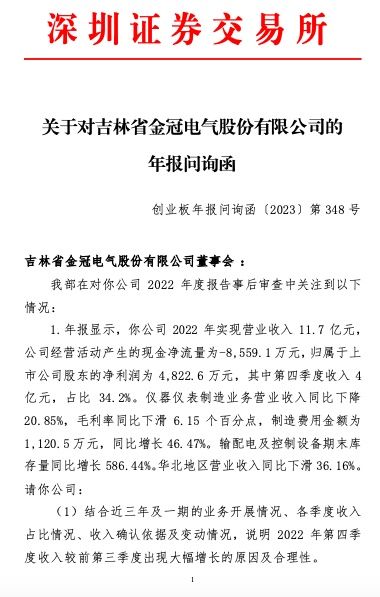 6月12日,吉林省金冠电气股份有限公司(以下简称“金冠股份”或“公司”)收到深圳证券交易所的年报问询函。问询函要求金冠股份结合近三年及一期的业务开展情况、各季度收入占比情况、收入确认依据及变动情况,说明2022年第四季度收入较前第三季度出现大幅增长的原因及合理性等。