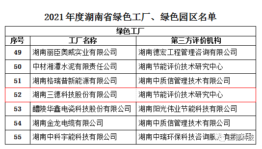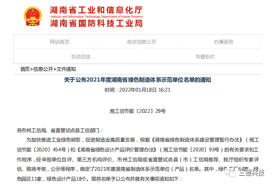 1月18号,湖南省工业和信息化厅发布《关于公布2021年度湖南省绿色制造体系示范单位名单的通知》。湖南三德科技股份有限公司荣获湖南省“绿色工厂”。