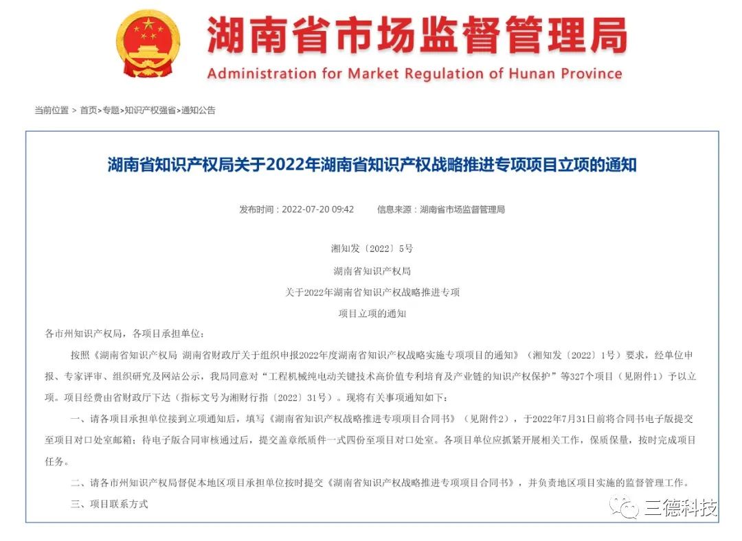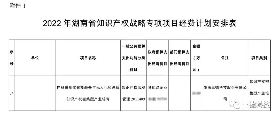 近日,湖南省市场监督管理局正式发布了2022年湖南省知识产权战略专项项目立项名单,三德科技“样品采制化智能装备与无人化验系统知识产权密集型产业培育项目”榜上有名。