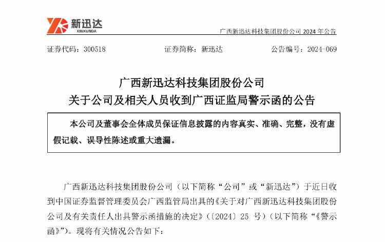 12月10日晚间,新迅达(300518)公告,公司及有关责任人因信息披露违规近日被广西证监局出具警示函。