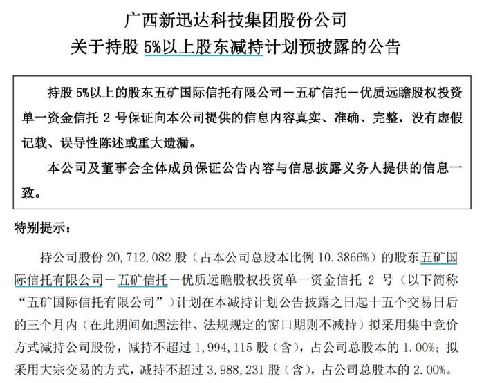 2025年6月22日晚间,广西新迅达科技集团股份公司(下称新迅达,300518.SZ)发布公告称,持股10.3866%的股东五矿国际信托有限公司因自身资金回笼需求,计划通过集中竞价和大宗交易的方式减持该公司股份,合计减持不超过598.23万股(含),占该公司总股本的3%。