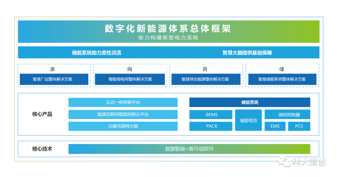 近年来,科大国创抢抓新能源汽车和智慧储能领域发展新机遇,充分发挥软件优势能力,自主研发了BMS、BEMS、PACK,智慧储能系统,光储充微网大脑,储能电站软硬件产品、系统集成、监控与运管系统,虚拟电厂等数字化新能源系列新产品与新技术,并取得了市场认可,形成了从电池模组- PACK-电池簇-储能系统-储能电站-储能电站监控运维平台-区域监控平台-集团新能源管控平台的全链产品矩阵,拥有打造软硬件一体的数字化新能源产品的雄厚实力。