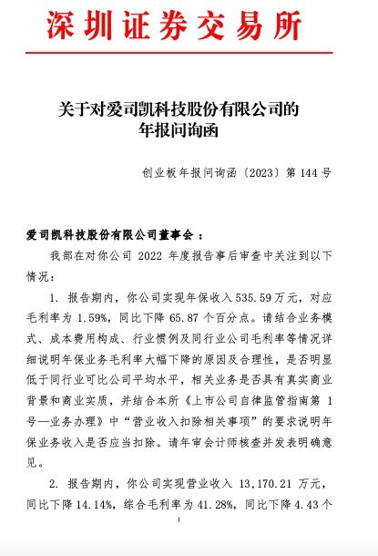 问询函称,深交所在对爱司凯2022年度报告事后审查中关注到以下情况: