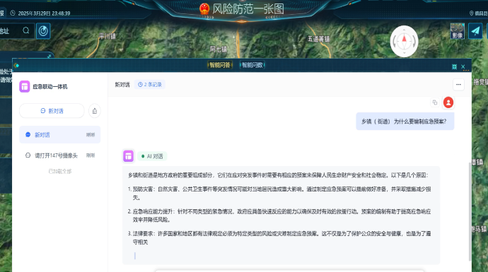 本产品自带大模型底座能力、智控能力、智数能力与公司积累的1000+应急行业知识。可提供专业知识的智能问答;支持通过指令检索和调阅视频、组织会议、拨打电话等;并可通过大模型对系统中的各类数据进行数据检索、关联查询、统计分析,深度挖掘本地业务数据价值,助力基层应急工作高效开展。