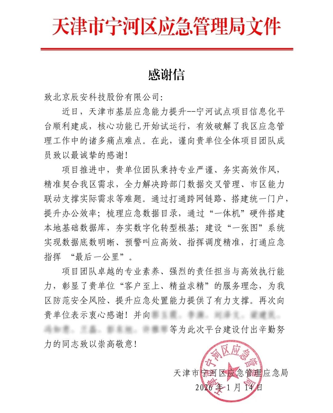 目前,辰安科技已在天津市宁河区成功打造了标杆案例,并收获了来自宁河区应急管理局的感谢信。该项目以基层应急联动一体机设备为核心载体,通过市级科技赋能基层,实现“硬件+软件+数据”一体化赋能、开箱即用,并可灵活扩展本地数据要素、整合本地信息化能力,有力支撑宁河区、街镇、村级的应急能力跃升,切实筑牢基层应急防线。