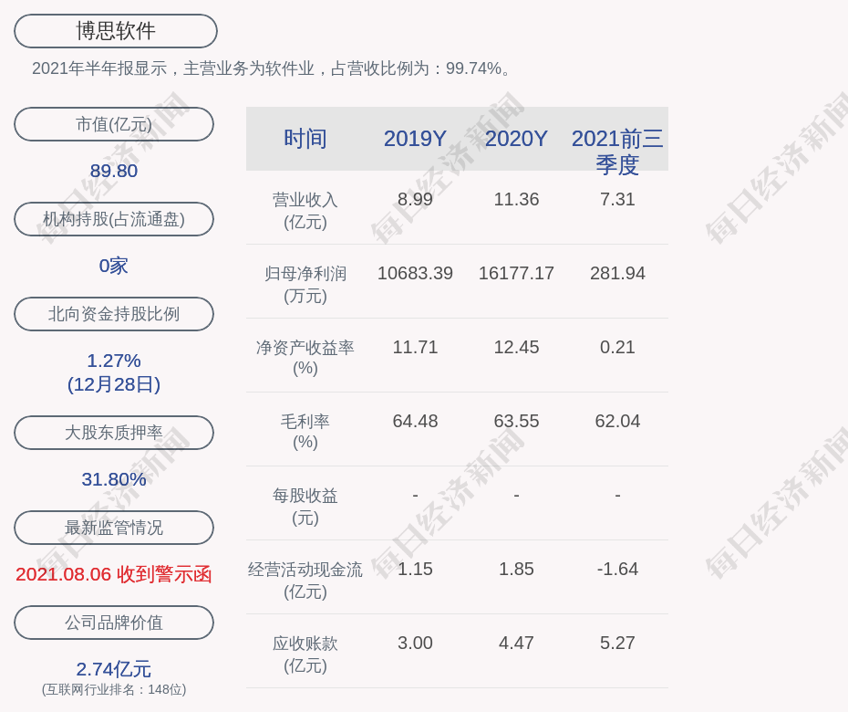 2021年半年报显示,博思软件的主营业务为软件业,占营收比例为:99.74%。