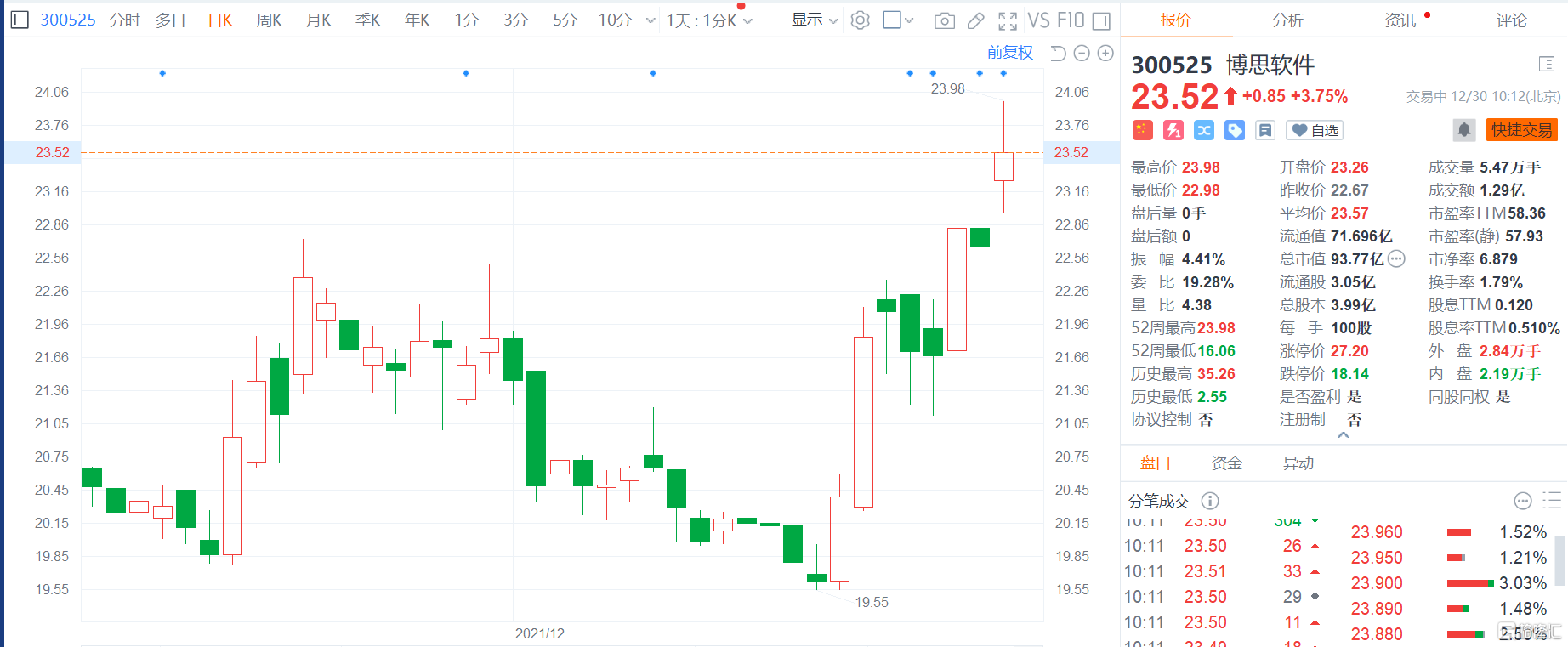 格隆汇12月30日丨博思软件(300525.SZ)涨约4%,报23.52元,高见23.98元创逾一年新高,总市值94亿元。博思软件公布2021年度向特定对象发行股票预案,本次向特定对象发行股票数量合计不超过1176.4705万股(含本数),不超过本次发行前公司股票总数的30%。本次发行价格为17元/股,本次向特定对象发行股票的发行对象为控股股东、实际控制人陈航。公司本次向特定对象发行股票募集资金总额不超过2亿元(含本数),扣除发行费用后全部用于补充公司流动资金。