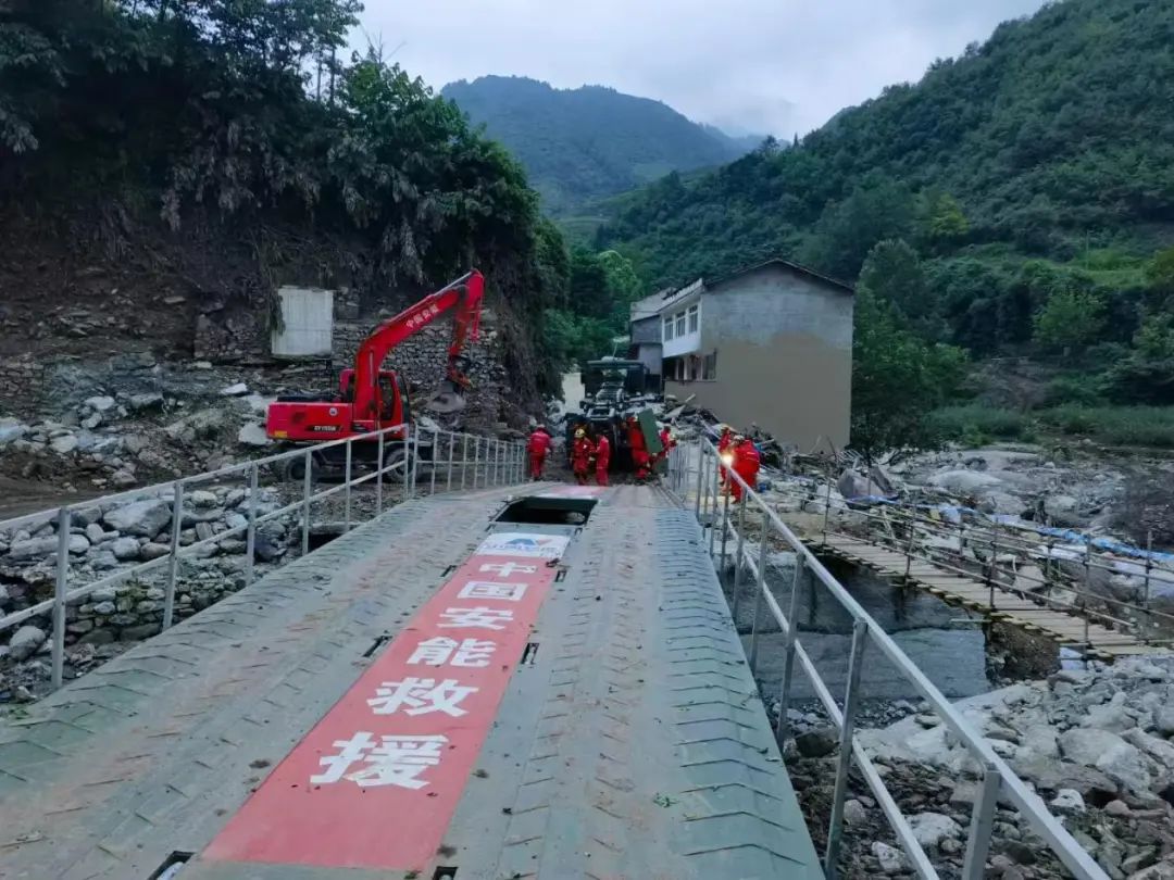 四川省公路交通应急装备物资储备中心在现场道路损毁处架设了一座21米应急机械化桥,有效保障救援人员和重型设备通行。架设前,中船应急和四川省公路交通应急装备物资储备中心进行了工作对接并提供技术支持。