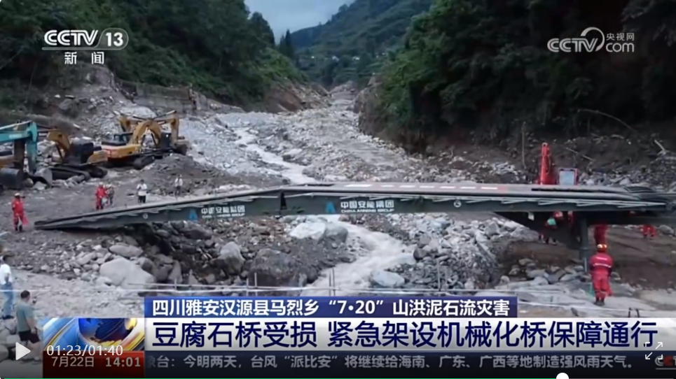日前,四川省雅安市汉源县马烈乡新华村发生暴雨泥石流灾害,导致通信、道路、桥梁中断,造成多人失联。灾害发生后,相关救援部门根据应急响应预案,迅速携带由中国船舶集团旗下中船应急生产制造的21米应急机械化桥、26米应急机械化桥、动力舟桥等装备,奔赴现场开展救援工作。
