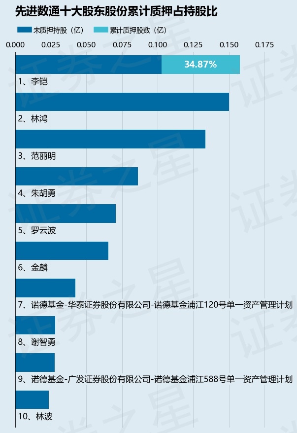 截止本公告日,股东李铠已累计质押股份550.0万股,占其持股总数的34.87%。本次质押后先进数通十大股东的累计质押股份占持股比例见下图:
