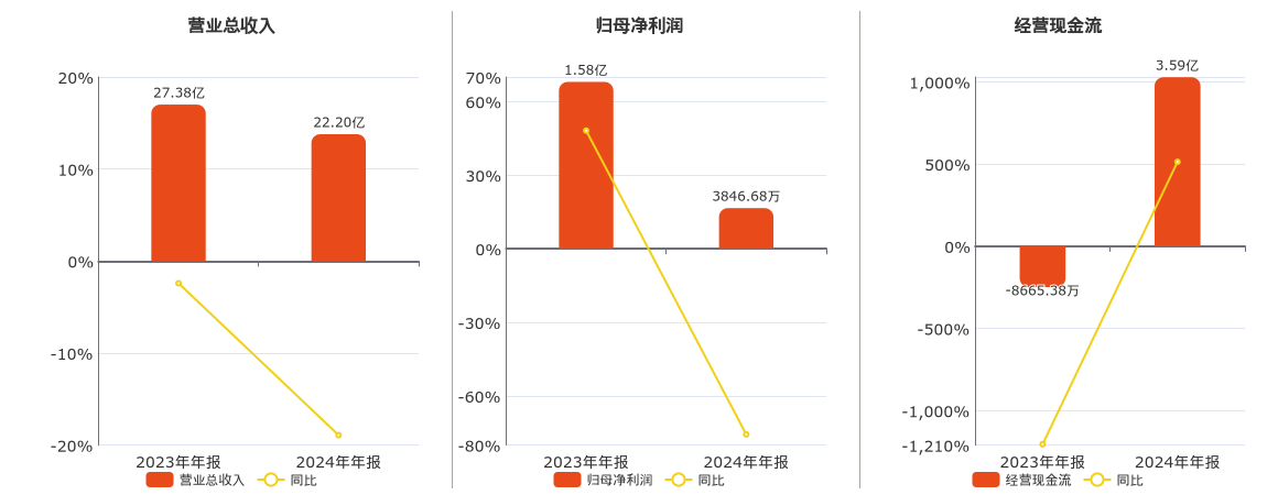 公司营业总收入为22.20亿元,较去年同报告期营业总收入减少5.18亿元,同比较去年同期下降18.92%。归母净利润为3846.68万元,较去年同报告期归母净利润减少1.19亿元,同比较去年同期下降75.64%。经营活动现金净流入为3.59亿元。