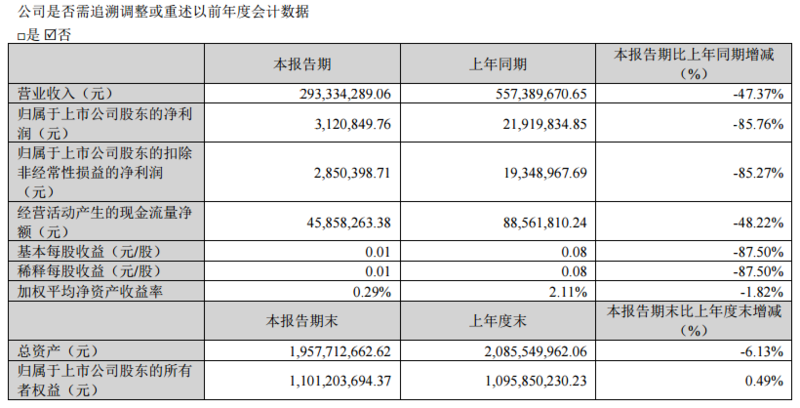 朗科智能表示,2023年一季度营收为2.93亿元,同比减47.37%,主要系业务量变化所致;归属于上市公司股东的净利为312.08万元,同比减85.76%,主要系利润总额变动所致。