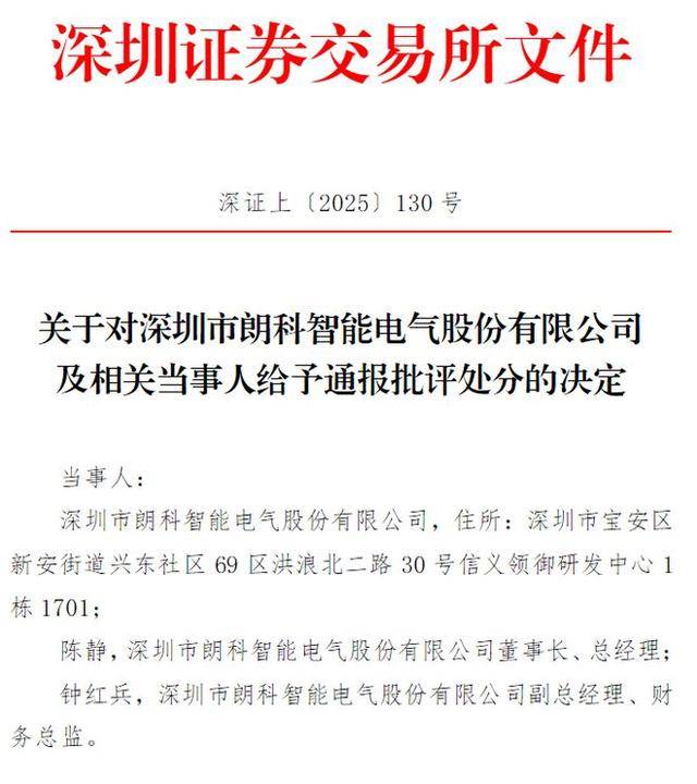 基于以上事实,深交所依据《创业板股票上市规则》的相关规定,对朗科智能及其管理人员陈静、钟红兵作出了通报批评的处分决定,并将此次违规行为及处理结果正式记入上市公司的诚信档案中。
