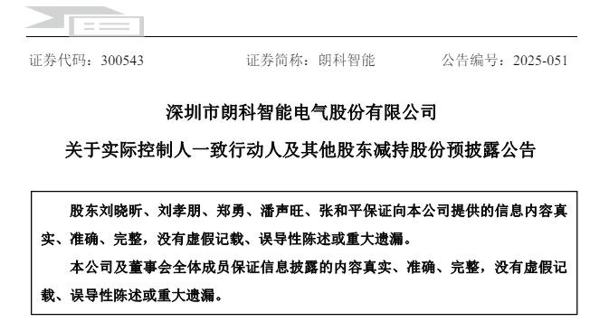 然而,与业绩增长形成对比的是,朗科智能多名股东近年来持续减持股份。2025年5月7日公告显示,包括实际控制人刘晓昕、刘孝朋以及自然人股东郑勇、潘声旺、张和平在内的五位股东计划合计减持不超过793.70万股,占总股本的2.59%。