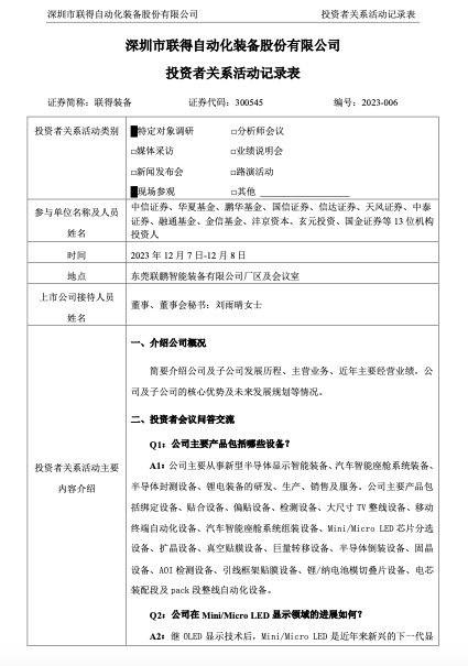 联得装备向投资者介绍了公司情况,公司主要从事新型半导体显示智能装备、汽车智能座舱系统装备、半导体封测设备、锂电装备的研发、生产、销售及服务。公司主要产品包括绑定设备、贴合设备、偏贴设备、检测设备、大尺寸TV整线设备、移动终端自动化设备、汽车智能座舱系统组装设备、Mini/Micro LED芯片分选设备、扩晶设备、真空贴膜设备、巨量转移设备、半导体倒装设备、固晶设备、AOI检测设备、引线框架贴膜设备、锂/纳电池模切叠片设备、电芯装配段及pack段整线自动化设备。