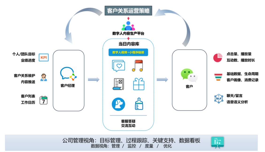 系统以元宇宙数字人作为服务客户的“门面担当”,以公司统一输出的内容库为客户经理提供日常沟通的话术“弹药”,以用户行为数据、用户标签等数据支撑为高净值客户提供资讯信息、日常问题回复、节日关怀、友情提示等精准服务。
