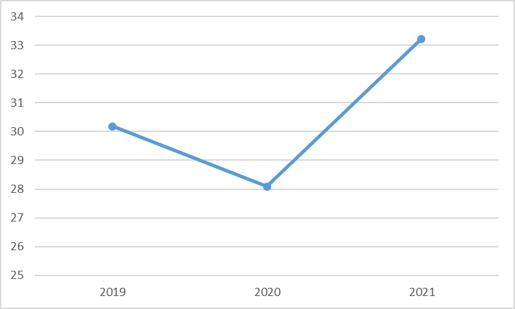 ——总资产曲折上升(见图1)。2019-2021年总资产分别为30.18亿元,28.09亿元,33.22亿元。2020年总资产规模同比下降6.93%,在2021年总资产规模同比增加18.26%。总资产规模曲折上升中,从该数据可以发现万集科技对扩大企业规模的决心。