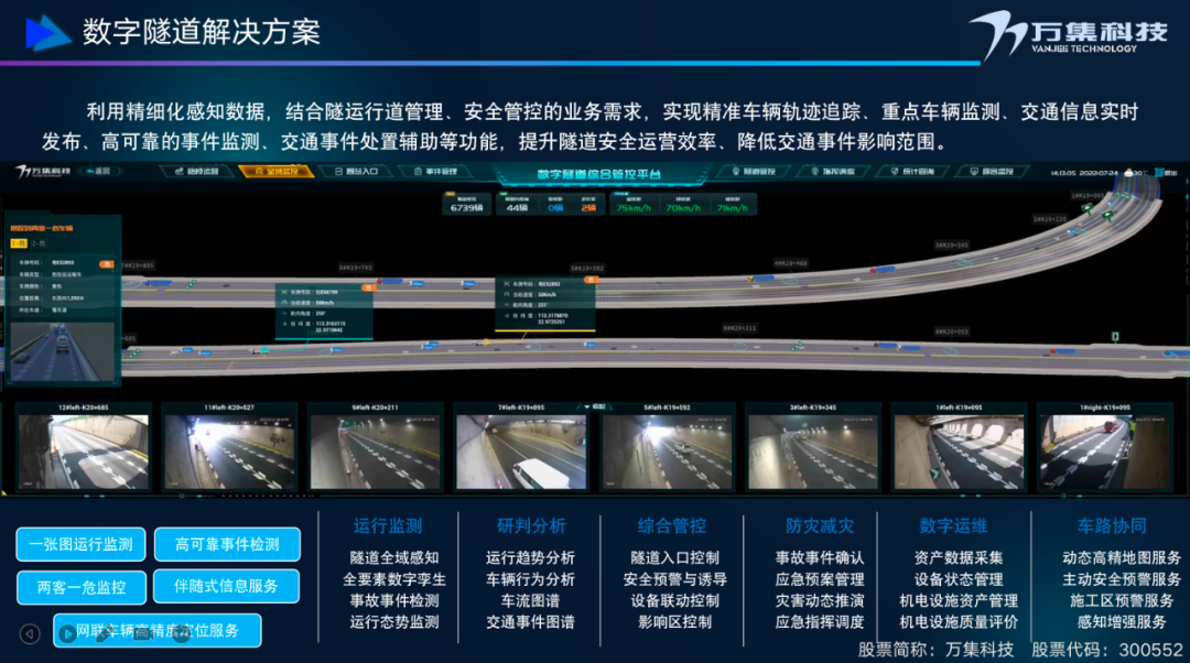 万集科技面向高速公路、国省道及城市快速路等建设热点,着眼于打造融合感知、时空数字底座和实战业务平台,通过毫米波雷达和视频融合,方案可实现车道级的动态交通信息获取;激光雷达和视频融合,实现准确率达98%的高可靠事件检测与交通流信息提取。在时空数字底座方面,通过GIS、BIM、高精度地图等,构建全面的公路时空底座,实现对交通参与者、交通事件、基础设施的实时孪生。