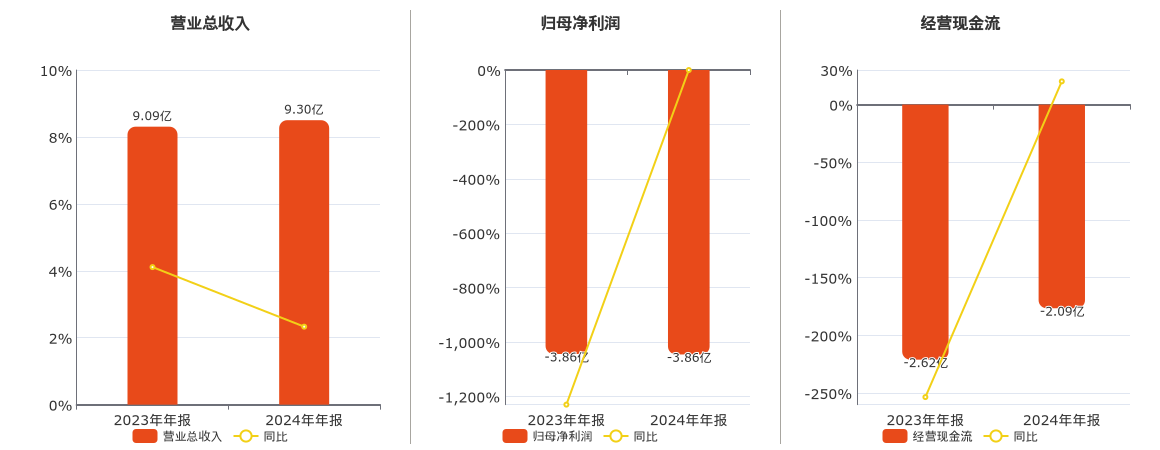 公司营业总收入为9.30亿元。归母净利润为-3.86亿元,较去年同报告期归母净利润减少57.77万元。经营活动现金净流入为-2.09亿元。
