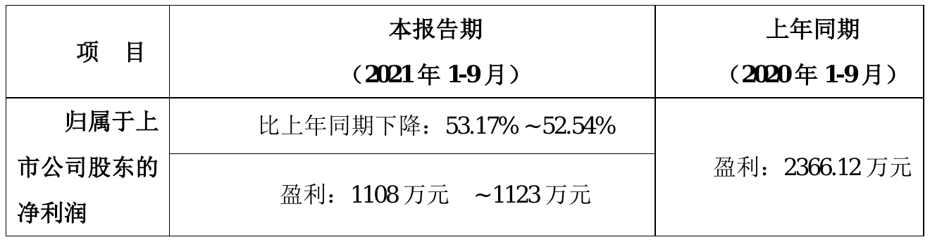 挖贝网10月19日,三超新材(300554)近日发布2021年前三季度业绩预告公告,预计2021年前三季度实现归属于上市公司股东的净利润为1108万元–1123万元,比上年同期减少53.17%–52.54%。