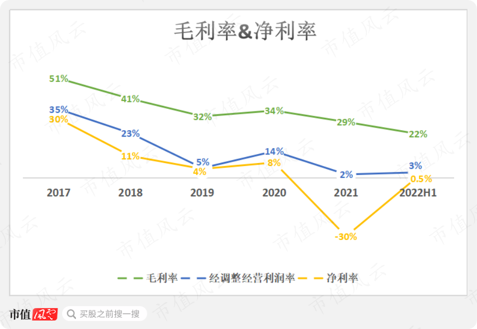 与之相对应的是,公司的经调整经营利润率逐年同步下滑,2021年仅2%,盈利能力堪忧。