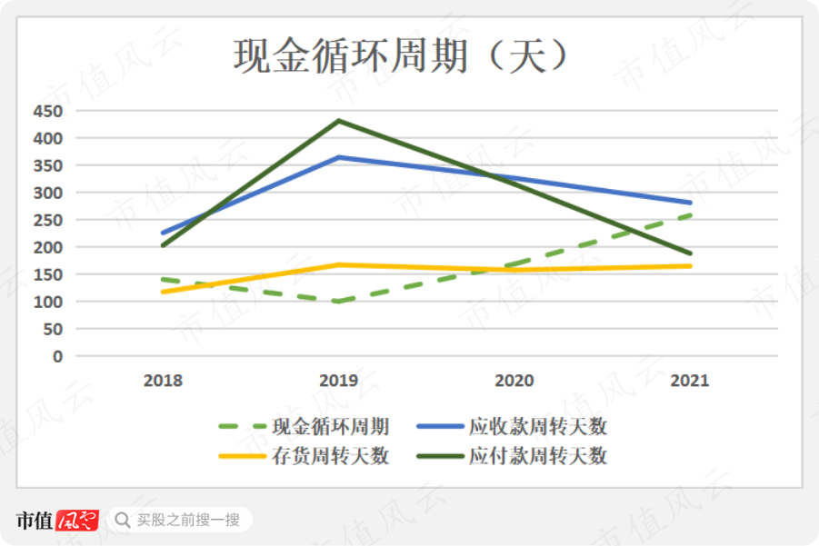 应付款周转天数近两年急剧下滑,使得公司的现金循环天数持续攀升,2021年完成一轮购存销需占用公司的资金近260天。