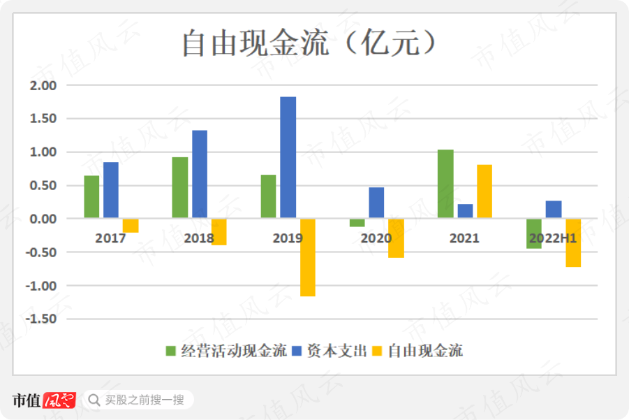 2017-2022H1,公司创造的经营现金流合计2.68亿,自由现金流合计净流出2.27亿,说明钱没赚到口袋里。