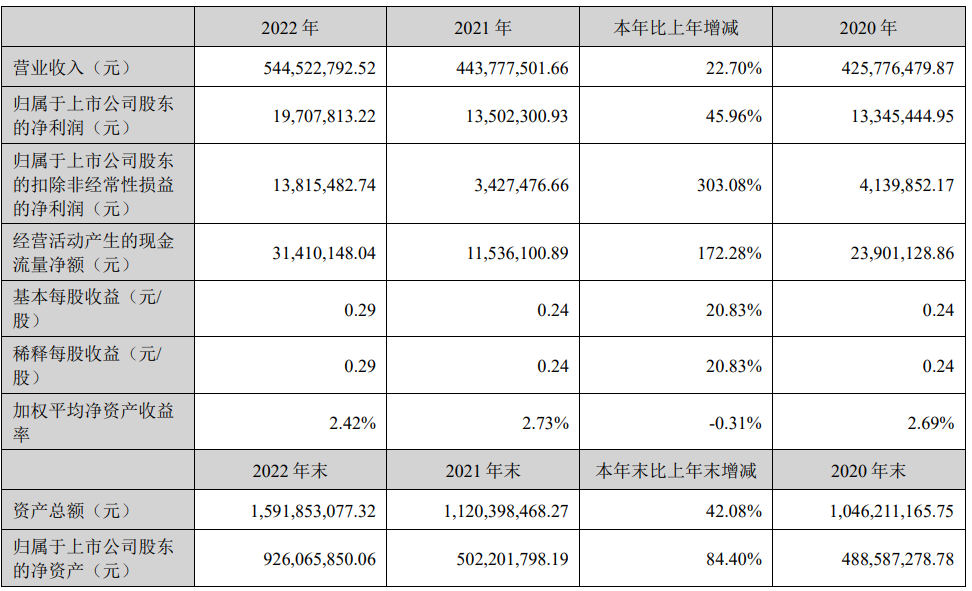 4/23/2023,光纤在线讯,理工光科发布2022年年度报告,公司报告期内营业收入5.45亿元,同比增长22.7%;归属于上市公司股东的净利润1970.78万元,同比增长45.96%;归属于上市公司股东的扣除非经常性损益的净利润1381.55万元,同比增长303.08%;基本每股收益0.29元。