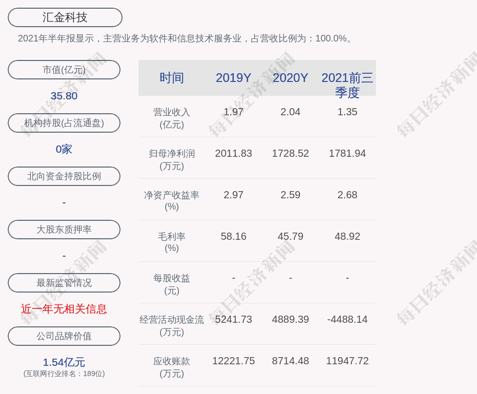 2021年半年报显示,汇金科技的主营业务为软件和信息技术服务业,占营收比例为:100.0%。