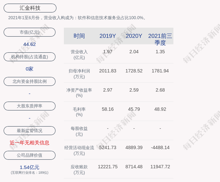 2021年1至6月份,汇金科技的营业收入构成为:软件和信息技术服务业占比100.0%。