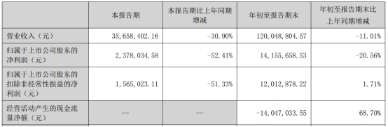 去年第三季度,公司实现营业收入35,658,402.16元,同比下降30.90%;实现归属于上市公司股东的净利润2,378,034.58元,同比下降52.41%;实现归属于上市公司股东的扣除非经常性损益的净利润1,565,023.11元,同比下降51.33%。