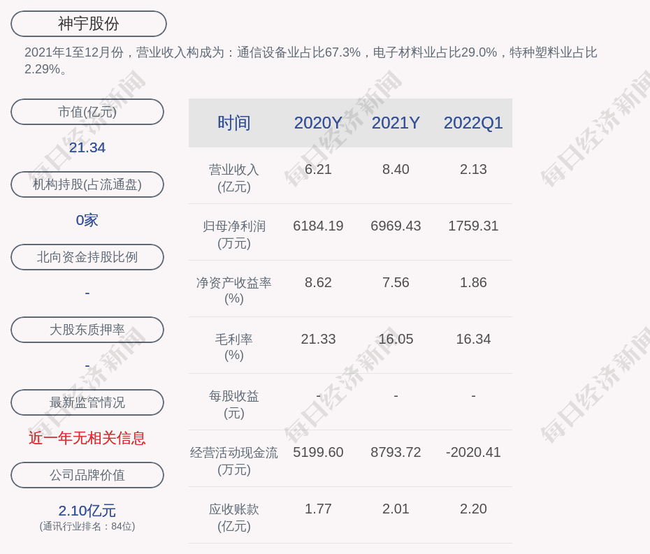 2021年1至12月份,神宇股份的营业收入构成为:通信设备业占比67.3%,电子材料业占比29.0%,特种塑料业占比2.29%。