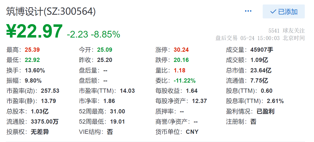 5月24日,截至收盘,筑博设计(SZ:300564)下跌8.85%,现报22.97元,成交额为1.09亿元,总市值为23.64亿元。