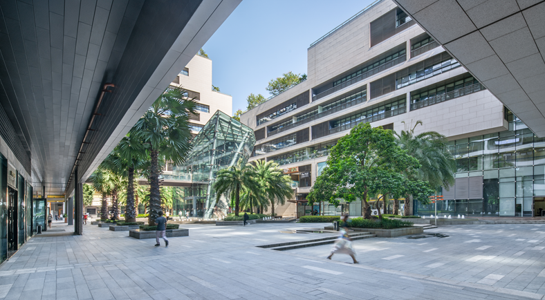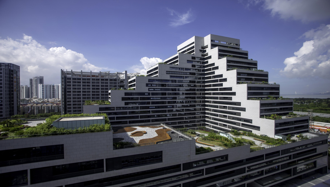 围合的庭院非常适用于广东的天气,不仅通风遮阳,还为办公人群提供全天候休闲和活动场所。阶梯状的屋顶以及部分掏空形成的露台空间为紧张忙碌的办公人群提供了休息和与大自然交流的场所,而露台有机生长并不断变化着的绿植使建筑看起来生机盎然。