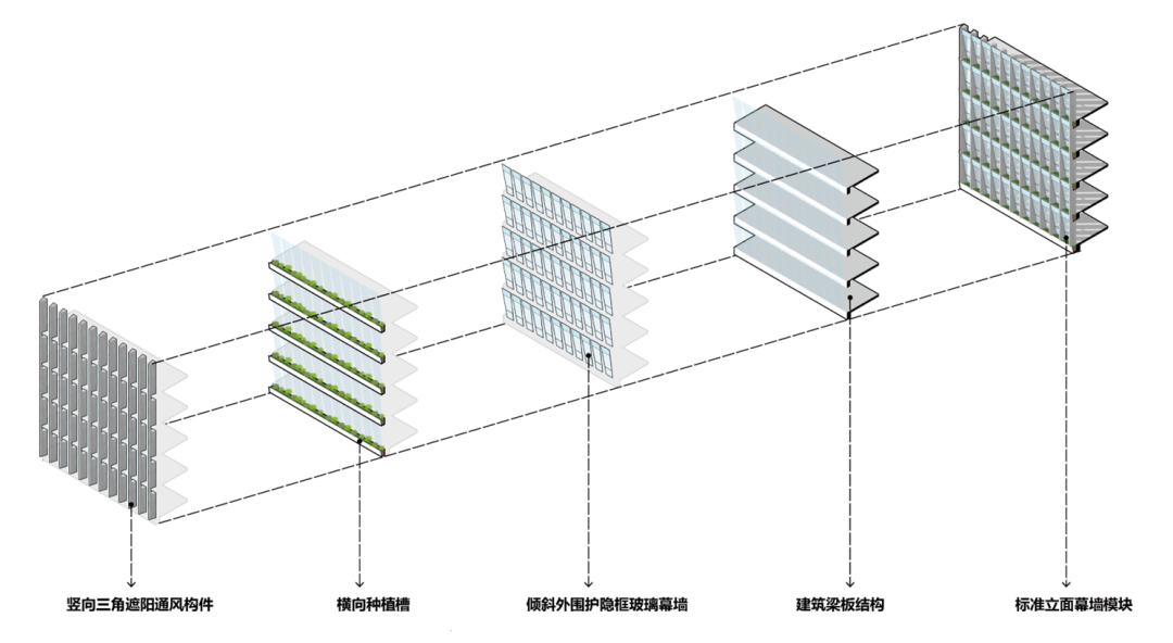 △点击了解坪山区档案馆方志馆:建筑立面由竖向三角构件矩阵构成,在遮阳、通风的同时形成了清亮饱和的光影效果,其背后嵌入的倾斜隐框玻璃幕墙,可以减少阳光直接穿透、有效节能。同时横向的平台可以作为种植槽,与屋顶花园一起增加整体绿化,改善建筑微气候。