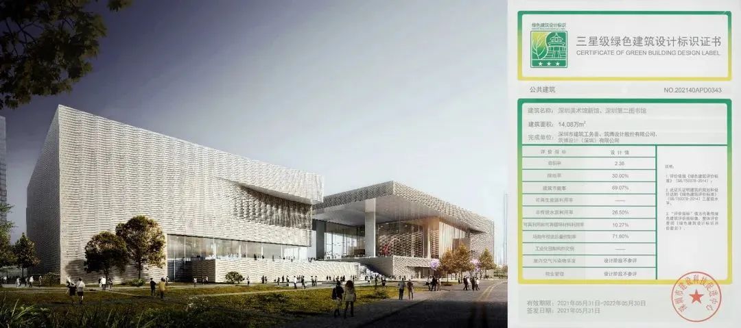 例如深圳美术馆新馆第二图书馆,建筑整体采用外立面遮阳系统,可以有效降低太阳辐射。遮阳系统使用的蜂窝石材重量轻、强度高、易安装,具有良好的隔音及隔热性能,能够有效降低建筑能耗。