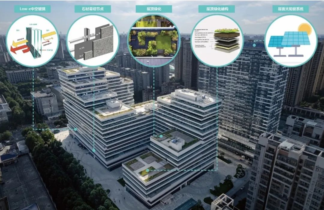 例如今年完工的国家大学科技园科创孵化基地,项目的绿色建筑措施除了合理的采光朝向、绿色节能材料等的运用外,还有退台屋面绿化、雨水回收和太阳能等等。