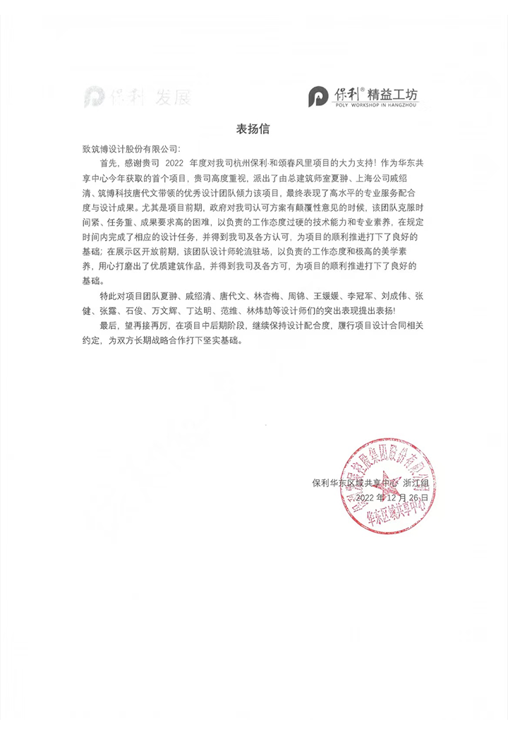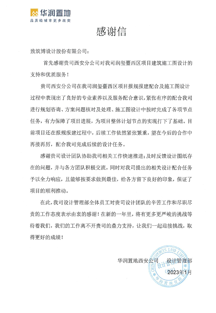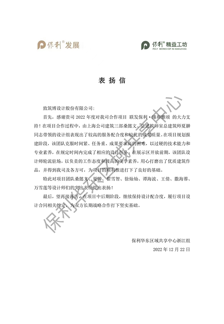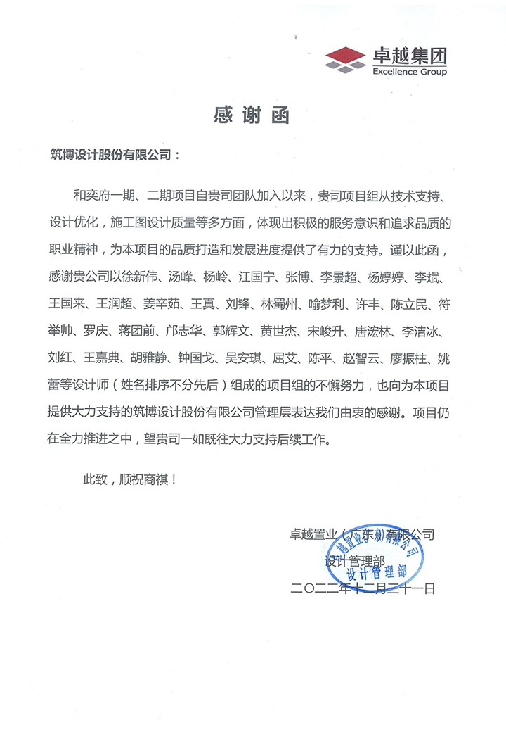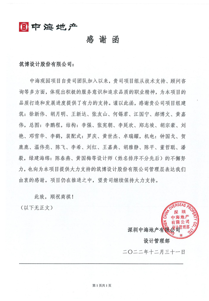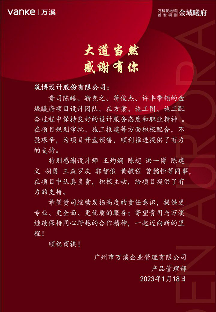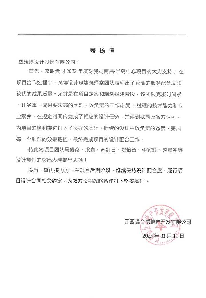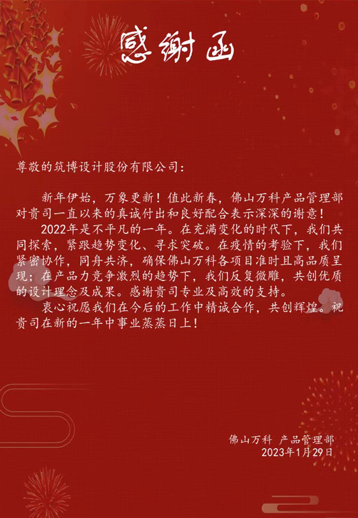 2022年,筑博设计各业务单元收到多封来自业主单位的感谢信与表扬信,信中表达了对筑博设计项目成果的肯定与各位同事辛勤付出的赞许,为2022年的工作画上了完美句号。期待新的一年与各业主单位加强合作,继续共赢!