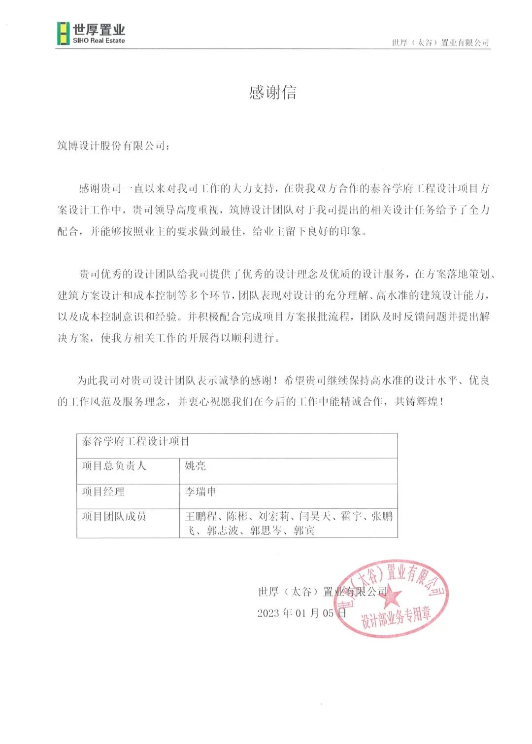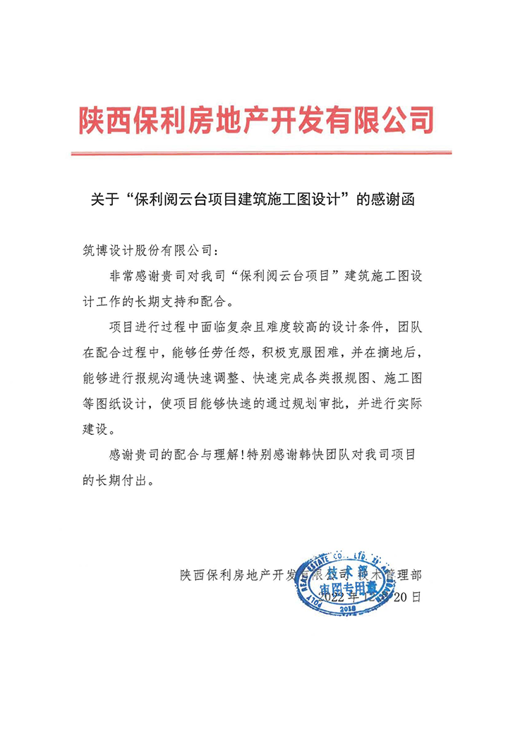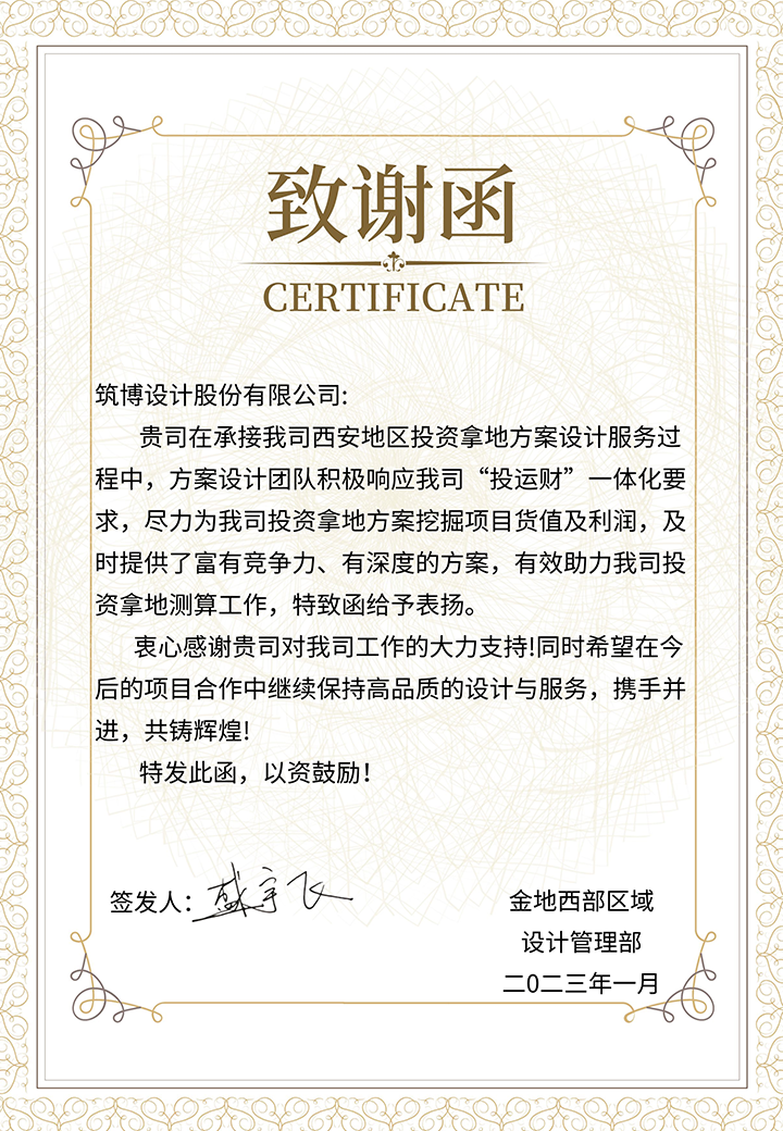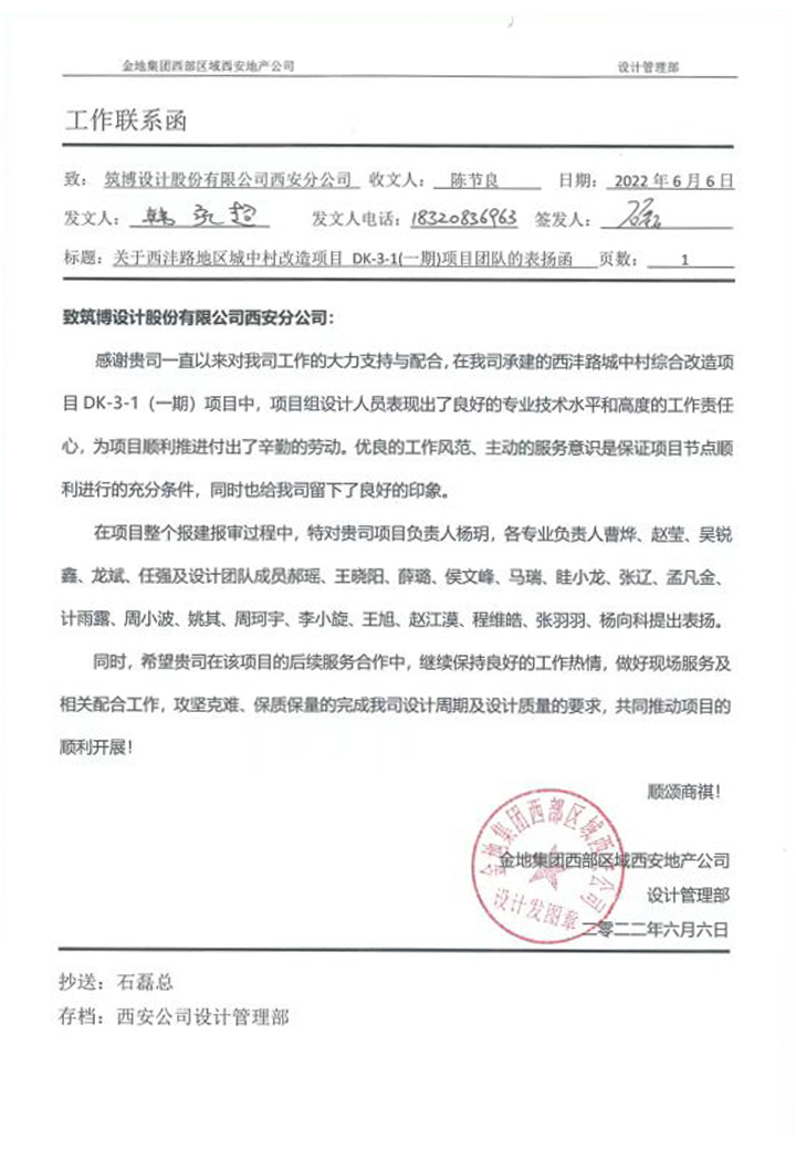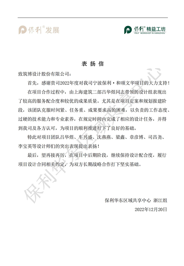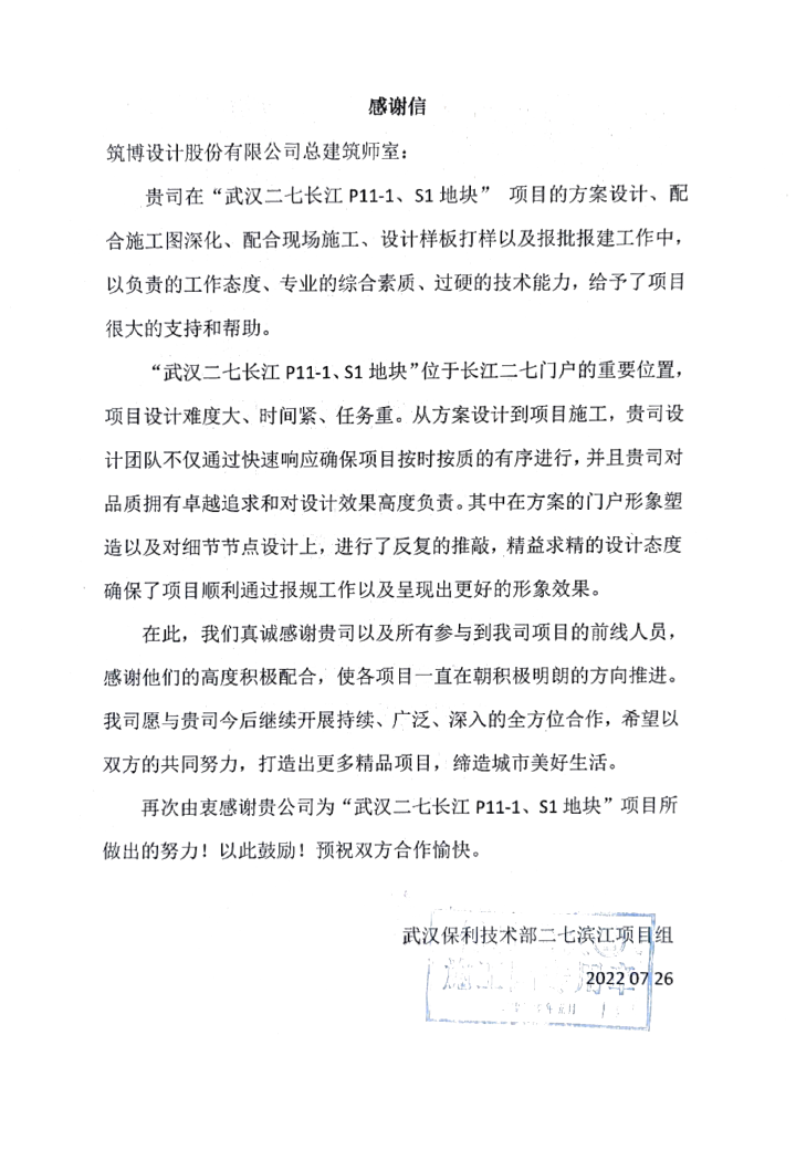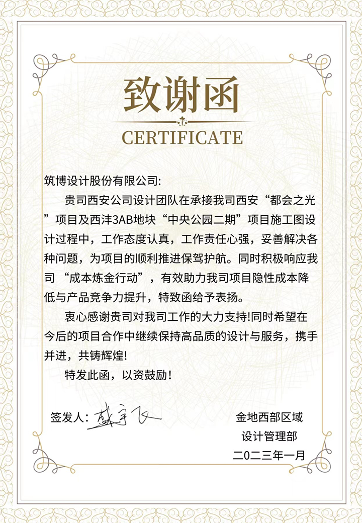 2022年,筑博设计各业务单元收到多封来自业主单位的感谢信与表扬信,信中表达了对筑博设计项目成果的肯定与各位同事辛勤付出的赞许,为2022年的工作画上了完美句号。期待新的一年与各业主单位加强合作,继续共赢!