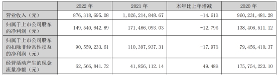 筑博设计同日发布2022年年度报告显示,公司2022年实现营业收入8.76亿元,同比减少14.61%;归属于上市公司股东的净利润1.50亿元,同比减少12.79%;归属于上市公司股东的扣除非经常性损益后的净利润9055.92万元,同比减少17.97%;经营活动产生的现金流量净额为6256.68万元,同比增加49.48%。