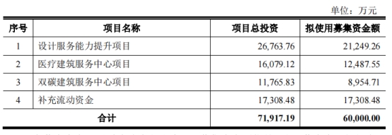 公司本次发行拟募集资金总额不超过60,000.00万元(含60,000.00万元),扣除发行费用后,拟用于以下项目:设计服务能力提升项目、医疗建筑服务中心项目、双碳建筑服务中心项目、补充流动资金。